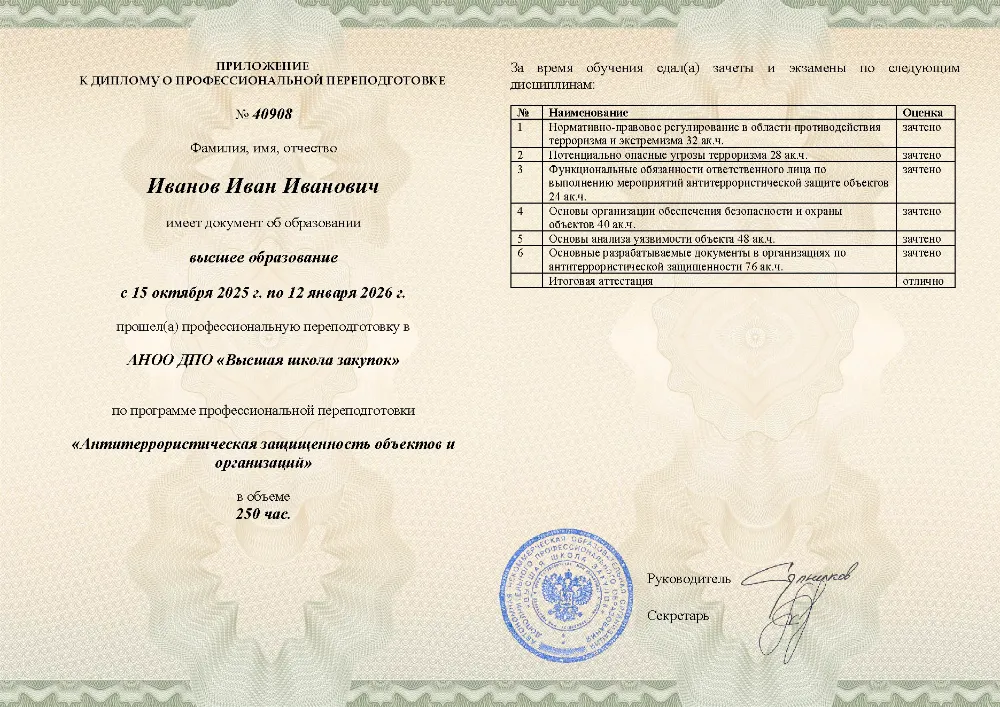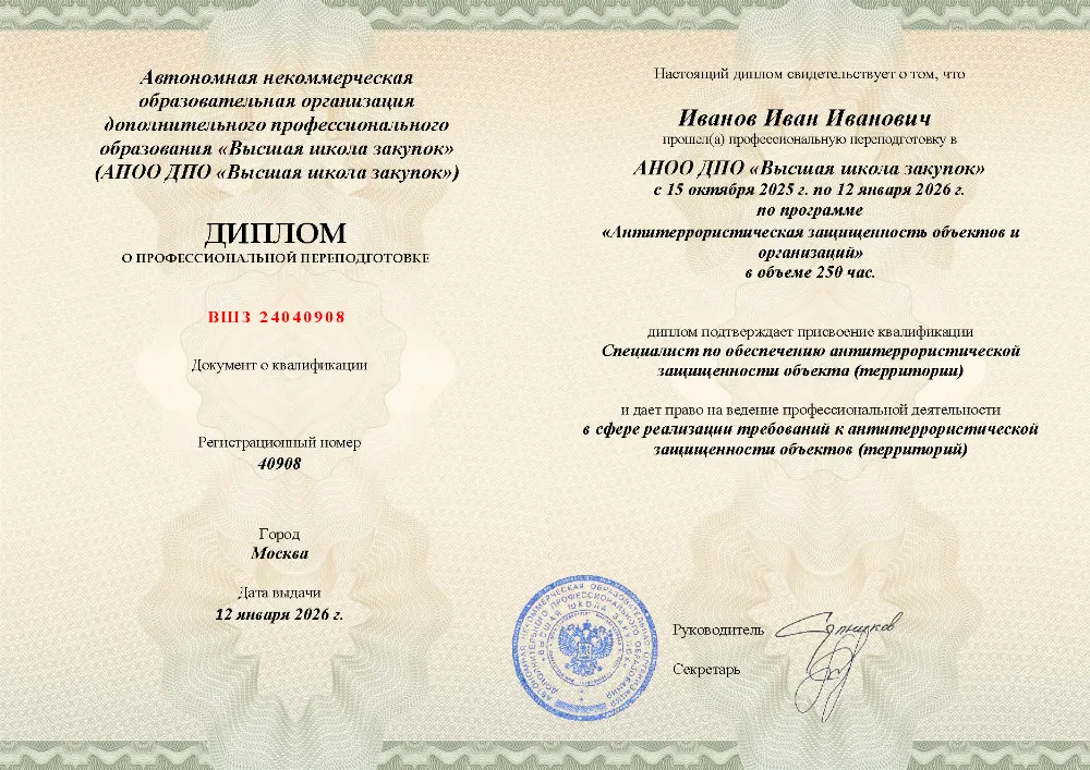 Профессиональная переподготовка, 250 академических часов, 6 модулей: нормативно-правовое регулирование и угрозы терроризма, функциональные обязанности ответственных лиц, основы безопасности и охраны объектов, анализ уязвимости и разработка необходимой документации. Онлайн-обучение в в Донецке с итоговой аттестацией.