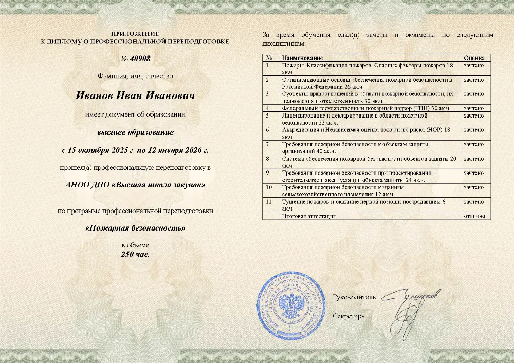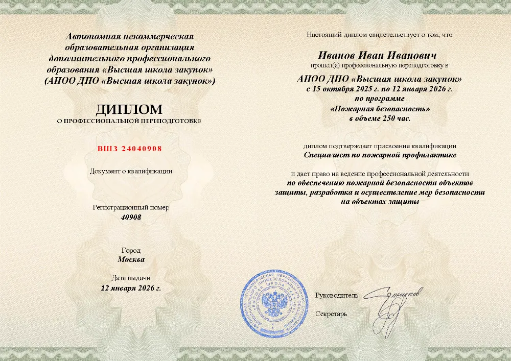 Профессиональная переподготовка, 250 академических часов, 11 модулей: организационные основы и законодательство в области пожарной безопасности, лицензирование и надзор, требования к объектам защиты, проектирование, тушение пожаров и оказание первой помощи пострадавшим. Онлайн-обучение в в Донецке с итоговой аттестацией.