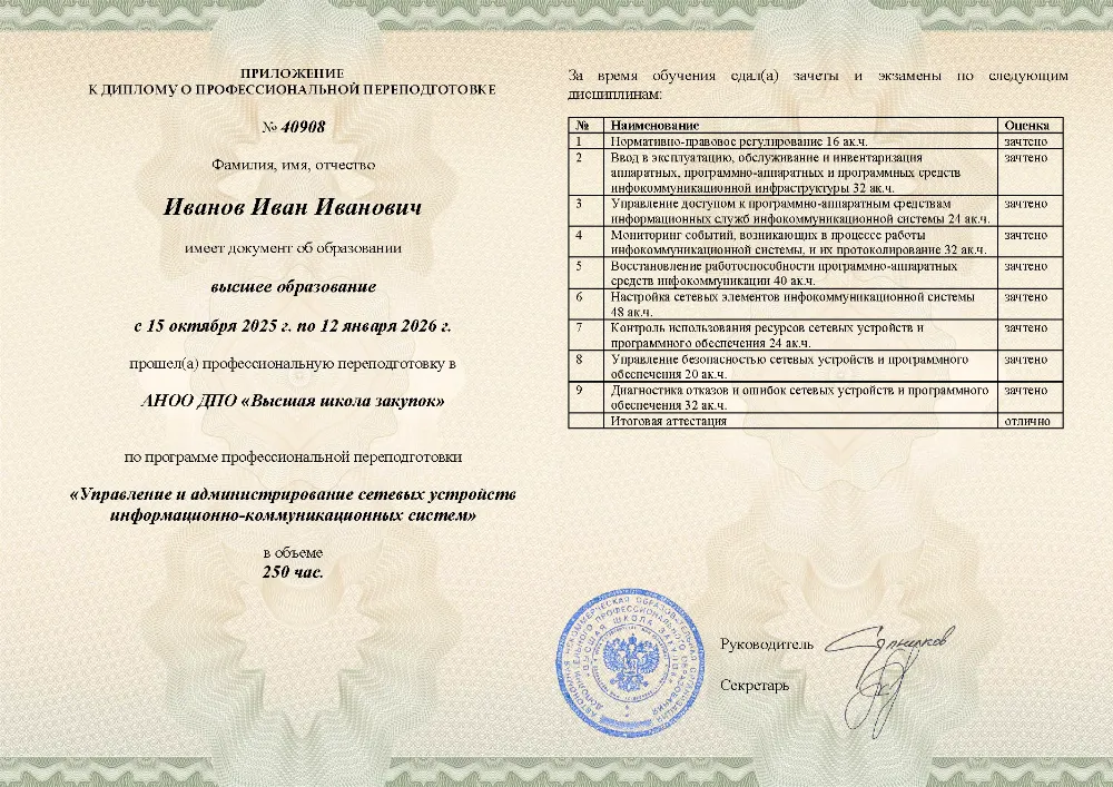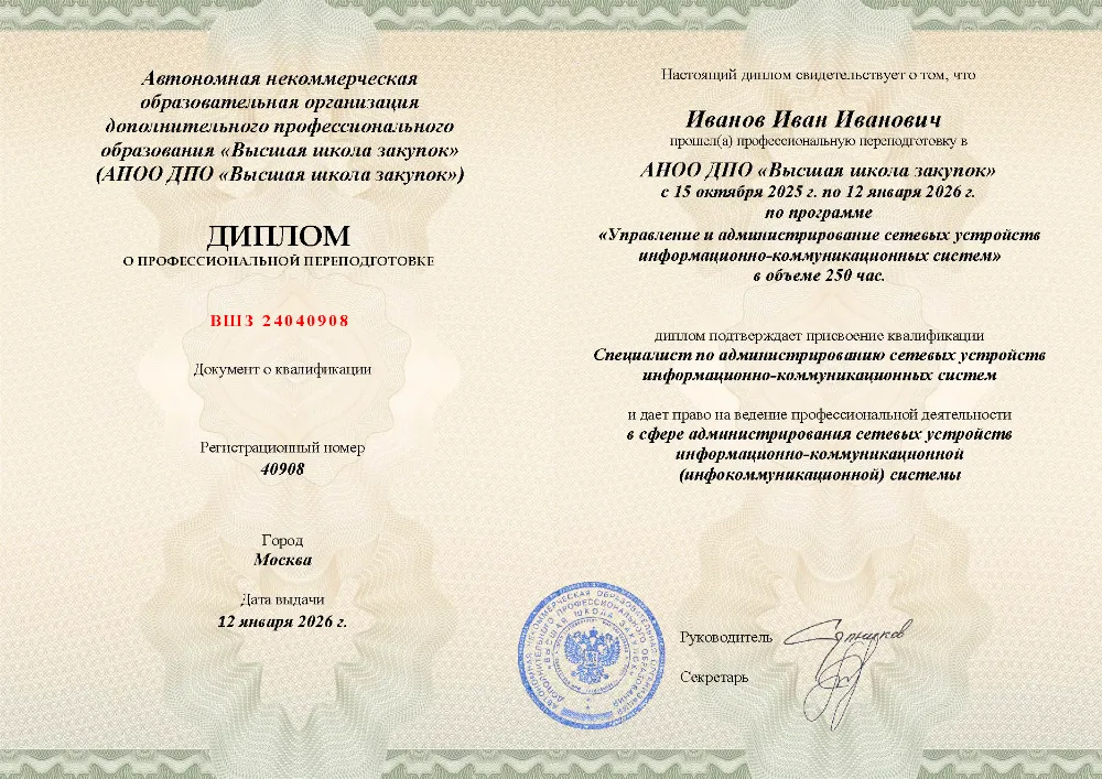 Профессиональная переподготовка, 250 академических часов, 9 модулей: нормативно-правовое регулирование и ввод в эксплуатацию, настройка и мониторинг сетевых устройств, управление доступом и безопасностью, диагностика и восстановление работоспособности инфокоммуникационных систем. Онлайн-обучение в в Донецке с итоговой аттестацией.