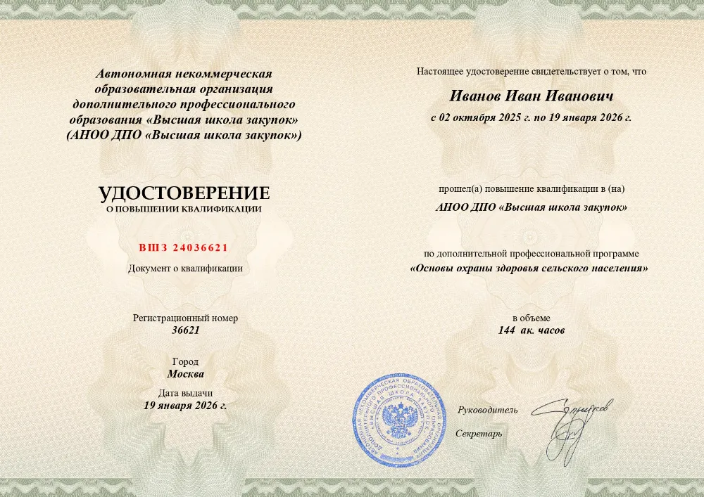 Курс повышения квалификации (144 часа) по основам охраны здоровья в сельской местности. Изучите правовые, организационные и экономические аспекты сельского здравоохранения, санитарно-эпидемиологическое обеспечение и управление качеством медицинской помощи. Онлайн-обучение в в Донецке с итоговой аттестацией.