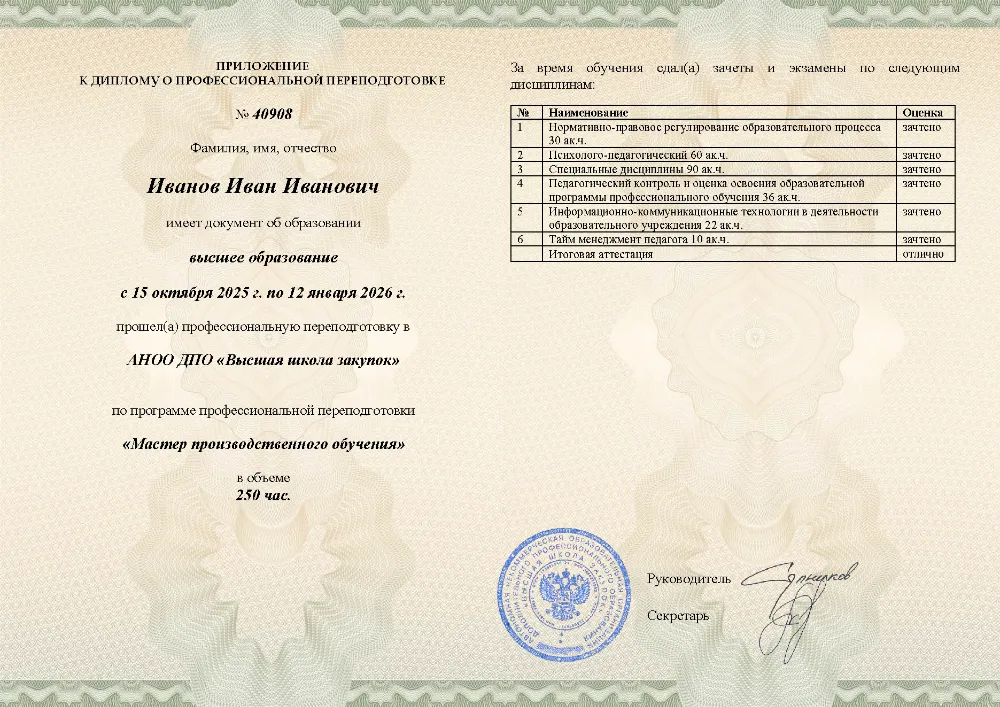 Профессиональная переподготовка, 250 академических часов, 11 модулей: нормативно-правовое обеспечение, основы педагогики и психологии, проектирование образовательных программ, методика профессионального обучения, педагогический контроль, применение ИКТ и тайм-менеджмент педагога. Онлайн-обучение в в Донецке с итоговой аттестацией.