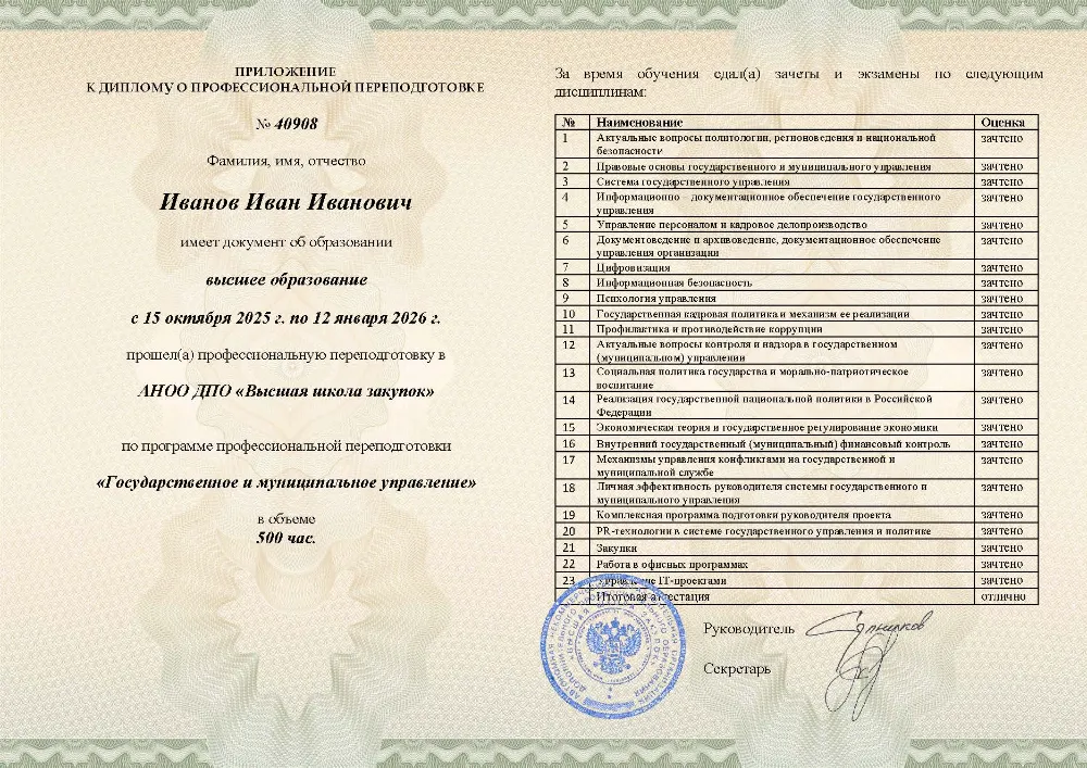 Профессиональная переподготовка, 500 академических часов, 25 модулей: правовые основы и система государственного управления, управление персоналом, финансами и противодействие коррупции, социальная политика и экономическое регулирование, цифровизация, закупки и информационная безопасность. Онлайн-обучение в в Донецке с итоговой аттестацией.