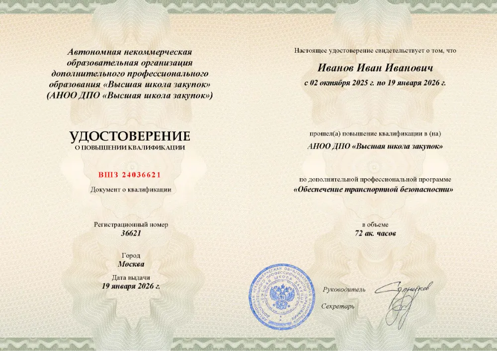 Повышение квалификации, 72 академических часа, 10 модулей: нормативная правовая база и система мер обеспечения транспортной безопасности, планирование и реализация защитных мероприятий, информационное обеспечение и государственный контроль, оценка состояния защищенности объектов. Онлайн-обучение в в Донецке с итоговой аттестацией.