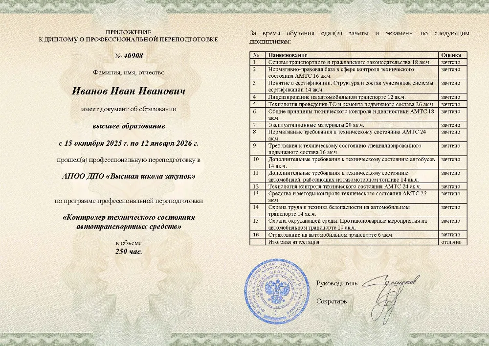 Повышение квалификации, 72 академических часа, 4 модуля: нормативные требования к техническому состоянию транспорта, технология и методы контроля, оценка состояния специализированного подвижного состава и автобусов, охрана труда и техника безопасности. Онлайн-обучение в в Донецке с итоговой аттестацией.